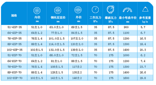 用途:高壓膠管主要用于油田固井,修井及石油地質(zhì)勘探,小型鉆機(jī)和水利采煤,輸送泥漿及常溫水等流體介質(zhì)。